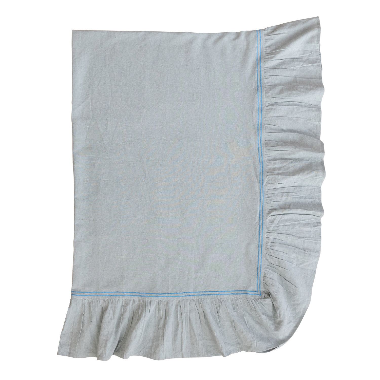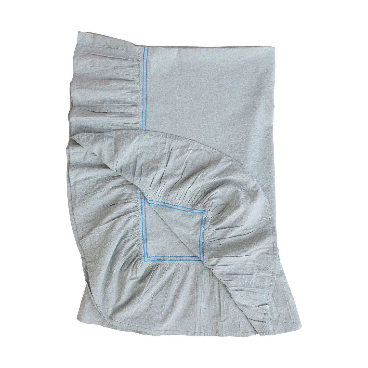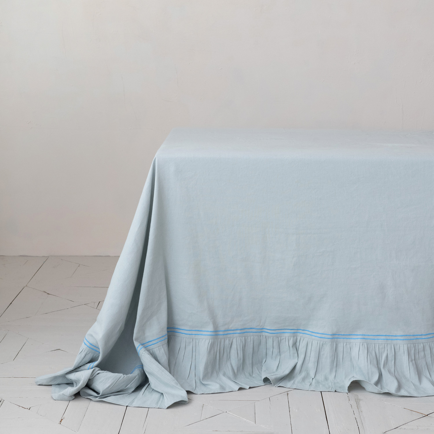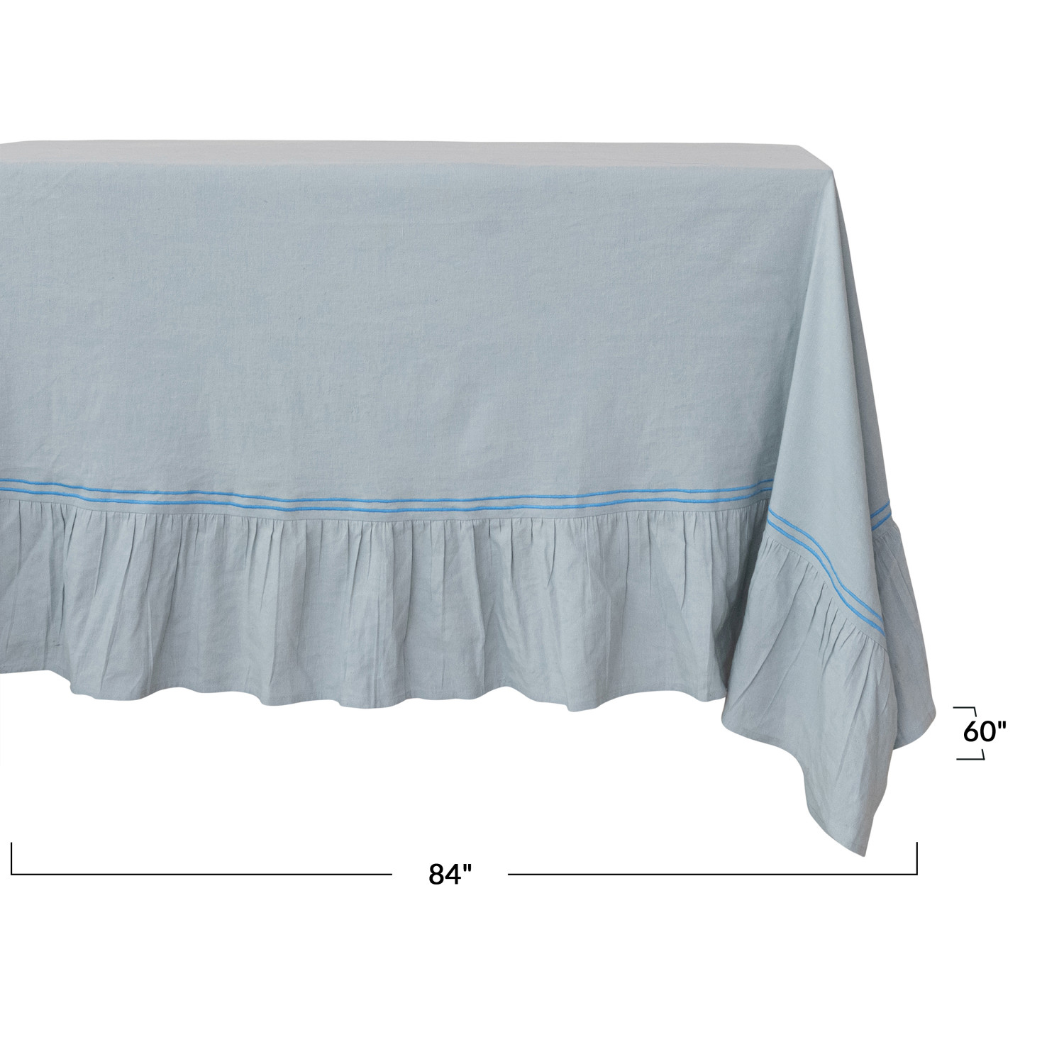 Cotton & Linen Tablecloth w/ Embroidered Trim & Ruffled Edge, Blue