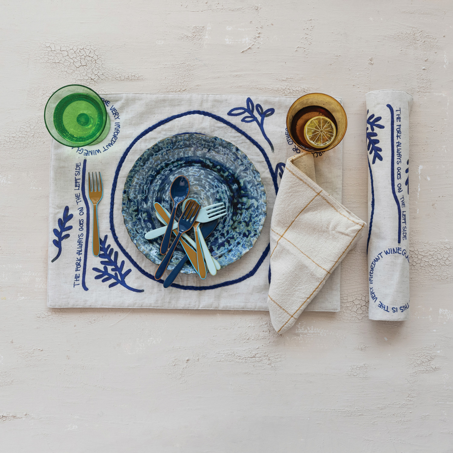 Woven Cotton & Linen Placemat with Embroidered Tablescape & Sayings